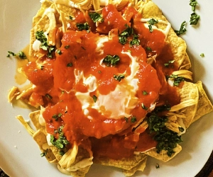 Crujientes nachos bañados en salsa roja o verde, acompañados de crema, queso fresco, cebolla y huevo, para un desayuno tradicional mexicano.