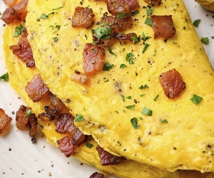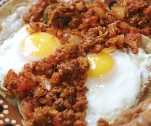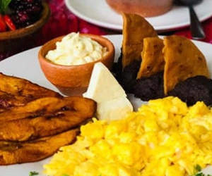 huevos jamón, queso, frijol, plátanos, queso y crema.