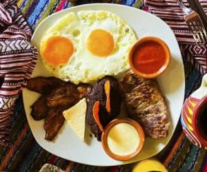 huevos al gusto, frijol, plátanos, queso y crema. Agrega longaniza por Q8.00