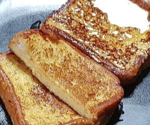 pan suave ligeramente dorado, bañado en una mezcla de huevo y especias, servido con un toque de azúcar y canela, acompañado de miel o jarabe de maple.